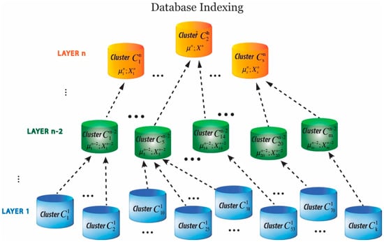 In an attempt to address the challenges faced by retrieval information on a large-scale dataset, we present a hierarchically nested structure. The introduced database indexing aims at arranging and structuring the image database into a simple yet effective form of data clusters and hierarchies. Although forming a hierarchical structure for retrieval optimization has been explored before [57,58,59,60], the method presented in this study is quite different. Hierarchically nested data clusters are structured in which data clusters at higher layers represent one or multiple clusters at a lower layer based on mean values of the cluster centers (Figure 3). The first layer clusters are generated based on feature representations derived from the CNN model. Data clusters are formed by grouping the relevant data points using a partition-based clustering approach known as K-means clustering [61]. Figure 3 illustrates how the hierarchical structure of clusters is formed. µ and X are abstract values and denote mean values and scalar products explained in Section 3.3.