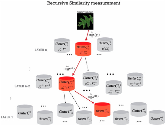 The final step after forming the hierarchically nested data clusters is to find the cluster which contains the most similar images to a query image. We applied recursive density estimation [62,63] to measure a similarity between the query image and all images inside each cluster recursively. The main idea of the recursive density function is to estimate the probability density function by a Cauchy type kernel and to recursively calculate it. The method is also applied for novelty detection in real-time data streams and video analytics [64]. The recursive calculation allows us to discard each data once it has been processed and only store the accumulated information in memory concerning the local mean (per cluster), µ and scalar product X. In order to speed up the retrieval process by an order of magnitude, the searching process is performed from the top of the pyramid in an ordered hierarchy based on “winner takes all” principle with maximum local recursive density estimation at each level (Figure 4).