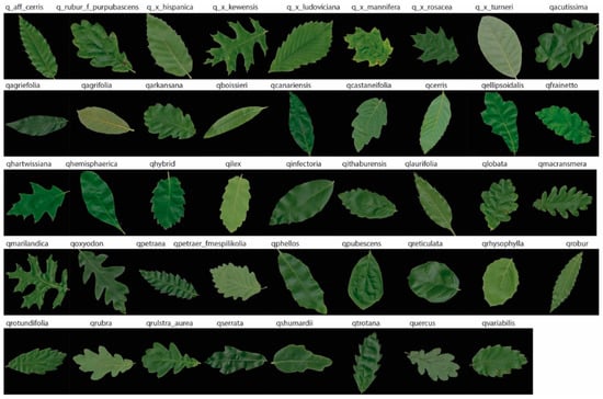 MalayaKew (MK) Leaf-Dataset: This dataset [72] consists of a collection of leaves from 44 species class, with 52 images in each class. The data is in the form of digital images, size 256 × 256 pixels, collected at the Royal Botanic Garden, Kew, England. The dataset has been used solely for supervised image classification, since the dataset is extremely challenging as some of the classes have very similar appearances (Figure 5) making it extremely difficult to distinguish differences between classes with a fully unsupervised model, as was presented in this study. Although the MK dataset is not considered a big dataset, we believe the similarity between classes can be a good example to demonstrate how discriminative the features are between the convolutional neural networks and the hand-crafted methods.