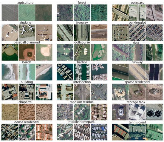 The University of California Merced (UCM) Dataset: UCM dataset [73] consists of 21 land cover, large-scale aerial images from the USGS national map urban area imagery. Each class contains 100 images with 256 × 256 pixels; the spatial resolution of each pixel is 30 cm measured in the RGB spectral space. The dataset has been widely utilized for evaluating the performance of high-resolution remote sensing image scene classification [74,75,76]. The UCM dataset shows very small inter-class diversity among some categories that share a few similar texture patterns or objects, which makes this dataset very challenging. Some sample image scenes from the UCM dataset are shown in Figure 6.