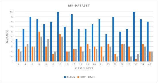 Figure 7. The retrieval Rank-20 accuracy between the Convolutional Neural Network (CNN) as a feature extractor, bag of visual words, and multiple feature fusion (color and texture).