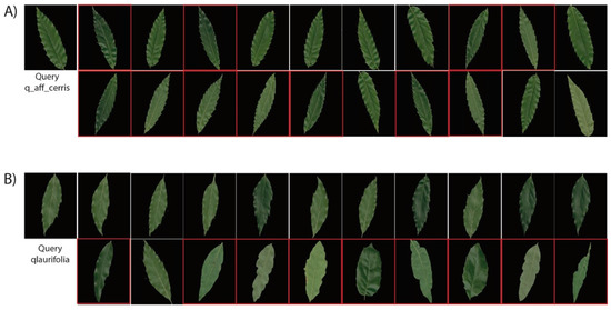 Figure 8. Qualitative evaluation of the proposed image retrieval on the two lowest performance of classes in Malaya–Kew Leaf-Dataset (A) Retrieval result from qlaurifolia class (B) retrieval result from q-aff-cerris class. The first image is the query and the following images are the images most similar to the query image. The retrieved images wrongly categorized are highlighted in red.