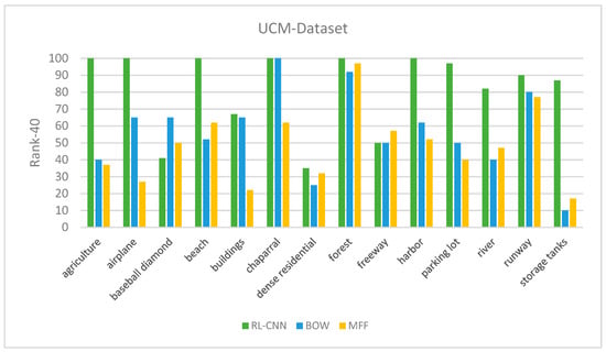 The retrieval mAP of different models on the UCM image dataset are listed in Table 1. As shown in the table, the RL-CNN outperformed both the state-of-the-art techniques. The mAP measure in RL-CNN is 90.1%, whereas the BOW and MFF achieved 86.2% and 69.8%, respectively.