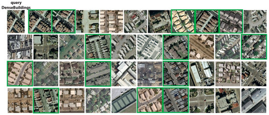 Figure 11. Retrieval results of dense-building category using convolutional neural network as a feature extractor (RL-CNN). The green rectangles indicate correct retrieval results.