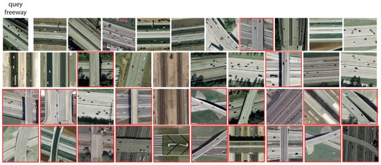 Figure 12. Retrieval results of freeway category using convolutional neural network as a feature extractor (RL-CNN). The red rectangles indicate incorrect retrieval results.