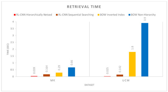 As illustrated in Figure 13, the proposed hierarchical indexing method achieved the fastest retrieval performance. The average retrieval time of RL-CNN with hierarchical indexing scheme on the MK and UCM image datasets are 0.039 and 0.025 seconds, respectively. RL-CNN with sequential searching came second with 0.164 and 0.142 seconds, respectively. Nevertheless, this is an O(N) linear operation; thus, the execution time increases considerably in the sequential searching if the number of images increases to hundreds of thousands or millions. BOVW with inverted index and BOVW without indexing had the slowest retrieval time, with 0.29 and 1.8 seconds and 0.66 and 3.9 seconds in MK and UCM datasets, respectively. Moreover, the RL-CNN with sequential searching showed faster performance compared to the BOW with a similar structure. This can be justified since the RL-CNN computes a 2048-D feature vector, whereas BOW generates a 42,000-D feature representation (Section 4, the bag of visual words). As a result, it takes more time to compute similarity for every individual image in the dataset.