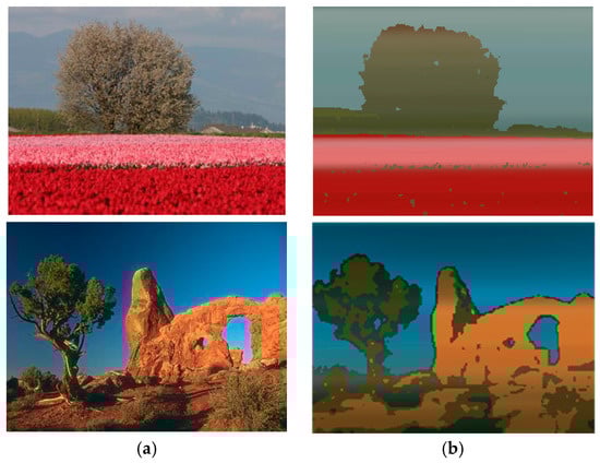Image segmentation examples: (a) Input image [18]; (b) Segmented image with each pixel classified as one of the four best matching dominant color clusters (prominent objects) in the input image.