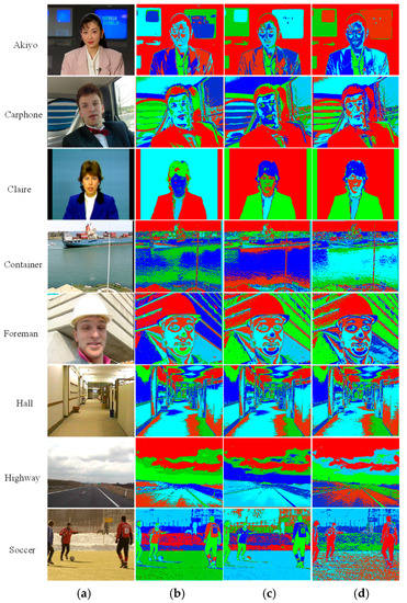 Thus, complex colorspace conversion operations can be entirely skipped if the incoming video stream is already in this format. Figure 2 compares the results of using LAB, YCbCr, and RGB colorspaces for segmentation with the Matlab intrinsic k-means function (L2-norm) on test images. Eight clusters are considered in each case, and they have been depicted by using eight corresponding pseudo-colors. It can be noticed that both LAB and YCbCr colorspaces give visually comparable results. The difference is perceptively discernable only in ‘Akiyo’ and ‘Container’. In fact, in these two cases, YCbCr gives better clustering of the blue screen (Akiyo) and the ocean (Container) than LAB. Prasetyo et al. [36] and Shaik et al. [37] have also noted the utility of the YCbCr colorspace in segmentation operation. Sajid et al. [38] have similarly employed YCbCr for background–foreground clustering. Figure 2 shows that the RGB colorspace works well in the case of pixel groups with markedly different shades of hue and illumination values. However, it fails to account for subtle changes in the illumination values of the pixels belonging to the same object (i.e., similar hue information) and clusters these separately. Thus, the thin outline of the screen in the background of ‘Akiyo’ is wrongly identified as a different object. Similarly, the field is not clustered properly in ‘Soccer’. Both YCbCr and LAB yield a better clustering solution in these cases.