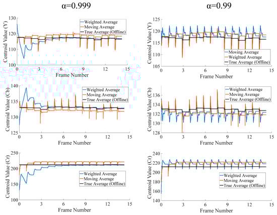 Practically, this limit is reached before processing even 10 lines of pixels in a moderate-resolution video frame, such as VGA (640 × 480). Thus, the revised formulation of the averaging operation in Equation (3) removes the need for expensive division operation. This alteration, however, does not affect the clustering performance of the overall algorithm noticeably, since the cluster centroids invariably depict similar variations during the processing of the whole frame, for both the moving and weighted average operations in the online clustering methodology. This behavior has been depicted for a representative centroid during the first 15 frames of the test video sequence “Hall” in Figure 4. It can be observed that both the moving and the weighted averages fluctuate during the processing of the frame, as new pixels are processed in the raster scan order. For reference, centroid values from an offline implementation of K-Means (Matlab intrinsic function) have also been plotted alongside. These have been labelled “True Average”, since offline methods access whole frames at a time to determine the centroid values. These a-priori values remain constant during the second pass of the offline algorithm when pixels are classified. We have plotted these values as references to judge the performance of the moving and weighted average-based on-line methods, respectively. Both the moving and weighted average-based methods initialize the cluster centroids with identical values (seeds) at the start of the first frame. It was noticed that for = 0.999, the moving average tracks the static true value very well. However, at the start, it takes roughly six frames for all three values (YCbCr) to settle. This “settling” time will be needed whenever rapid scene changes occur in the video frames, and the centroids shift positions. At 15 frames per seconds (fps), this translates to less than half a second. A higher value will further increase this delay. Decreasing to 0.99, decreases the settling time to just one frame but also leads to more fluctuation. It is worth noting that even at this rate, it causes lower fluctuations than the moving average. Thus, the weighted average is a better choice in either case.