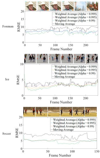 To further investigate the performance of weightage average-based on-line algorithm, the combined error in the calculation of all of the centroid centers with reference to standard offline implementation has been gathered on test video sequences. The root means squared error (RMSE) has been used as the metric to evaluate different settings, and it has been reported on per-frame basis. Eight clusters have been considered in all of the experiments. “Y” information is included and L2-norm is used for distance calculation. The centroids are randomly initialized around the middle value, 127, of the dynamic range [0 255] of the pixels. Figure 5 plots the RMSE per frame for three video sequences, with high motion content. These plots further confirm the observations made in Figure 4. Weighted average with = 0.999, yields the lowest RMSE for most of the frames. At the start and during rapid scene changes, however, it rises to higher values, as discussed previously. The moving average performs poorly in all if the cases considered, except during a few frames in ‘Foreman’ and ‘Ice’ sequences. Thus, even for high-motion video sequences, the error in the centroid’s values, calculated through the weighted average ( = 0.999) is upper-bounded by the error for the moving average, with reference to the corresponding offline implementation.