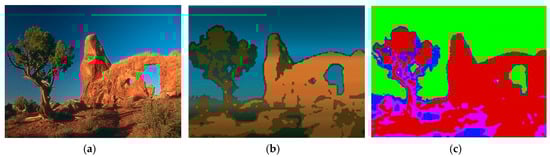 Image segmentation output options: (a) Input image [18]; (b) Output image with each pixel replaced by its corresponding cluster’s centroid value; (c) Output image with pseudo-colors to denote clustering.