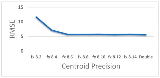 The centroids of eight clusters are updated using the output from ‘Comparisons Module’ and the current pixel. The centroid values are stored in registers as fixed-point values using a word size of 18 bits with eight fractional bits. The precision for fractional bits has been decided, based on the accuracy loss behavior that is depicted in Figure 9. RMSE for test video sequences were gathered for different bit precisions. It was observed that the RMSE error metric shows a sharp rise when the fractional bits are reduced below 6. On the other hand, the allocation of up to 14 bits yields a performance that is at par with the double-precision floating point software implementation. Thus, eight fractional bits seems to be a reasonable choice. Ten further bits were allocated for the sign and magnitude, with a 1-bit margin for overflows. The centroids are initialized to random values around 127 at the start, as used in the experimental setup described in Section 3.1.