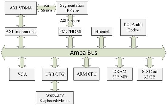 Finally, the Simulink HDL Coder is invoked to convert the hardware model into AXI4 streaming bus compliant IP core in the form of HDL sources. To test the functionality of this IP core in a practical environment, a Hardware–Software co-design (HW-SW) has been setup on a Xilinx Zedboard, which houses Xilinx Zynq-7000 AP SoC XC7Z020-CLG484 FPGA running at 100 MHz. The hardware portion has been implemented in the Xilinx Vivado tool, with all the peripherals, as well as the segmentation IP core connected across a single bus, as shown in Figure 10. The software environment is based on Xillinux, an operating system based on Ubuntu for ARM. The application to test the IP core functionality makes use of OpenCV computer vision library as well. This setup ensures that three different sources of video streams can be used to feed the developed IP core, i.e., the High Definition Multimedia Interface (HDMI) on the Zedboard, USB webcam or the stored files on the flash memory card decoded through software library. For the former two sources, the AXI Video DMA core accesses a dedicated section of Random Access Memory (RAM) to read/write input/output frames.