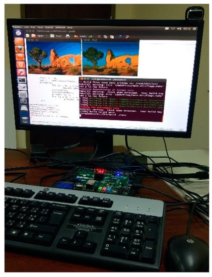 Figure 11 shows an operating scenario where an image that is stored on the flash memory card is written to RAM in software. The segmentation IP core reads (via DMA) this image, processes it and then writes the output image (via DMA) to a different RAM segment. The software subsequently displays the output via OpenCV library functions. The continuous video stream from a USB webcam can be used as input in the similar fashion. For HDMI/FMC input/output, however, video capture and display devices need to be connected to the respective peripheral channel. For experimentation, the input/output frame size has been fixed at VGA resolution (640 × 480). The entire framework, including the Simulink models, the Vivado project files for the HW-SW co-design, and software routines are available for download as open-source code, to facilitate researchers and practitioners.