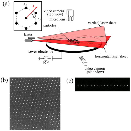 (a) Schematic diagram of the experimental setup. The inset shows the chosen orientation of the crystal lattice. (b) Top-view image of a 2D complex plasma crystal. (c) Side-view image of a 2D complex plasma crystal. Note that images (b,c) have been heavily reworked (nonlinear contrast and luminosity enhancements, Gaussian smoothing) and are therefore for illustration only.