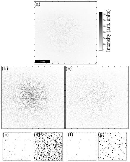 In Figure 6b–d, the maps of the monolayer showing the crystal defects, the local value of , the local number density, and the local kinetic energy are shown. At the beginning of the instability (Figure 6b), the crystalline structure at the centre of the monolayer was almost perfect with very few defects. However, due to MCI, at the centre of the monolayer where it is at its densest, the kinetic energy was slightly higher and was slightly below 1 due to local deformation owing to the synchronised motion of the microparticles [,]. This effect could be also seen in the local particle number density with the appearance of fringes at the centre of the monolayer. At s (Figure 6c), the kinetic energy at the centre of the monolayer has grown high enough to partially destroy the crystalline order and lead to the appearance of defects. in this region is well below 1, and the number density fluctuations due to the monolayer entering the fluid regime were well pronounced. At s (Figure 6c), the monolayer was well into the fluid MCI regime []. The kinetic energy at the centre of the melted monolayer was very high, and the melted zone was expanding outwards. Many defects are visible. revealed the very sharp border of the melted zone. Large number density fluctuations were seen in the centre. Note that they were larger than the real fluctuations due to the 3D nature of the microparticle motion, which could not be tracked at all times (the results would be even worse using the quasi-static approximation). Dust density waves (“sound waves”) were also generated by the melted spot and observed in the number density and kinetic energy maps. In recent studies, MCI-induced melting was used to simulate rapid melting and flame front propagation in 2D matter [,] as well as thermoacoustic instability []. These studies would not have been possible without efficient tracking of the trajectories in all regions of the microparticle monolayer.