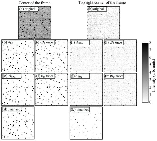 (a,h) Zoom of the raw original frame shown in Figure 2 in the centre and at the top right corner, respectively. Note that the grey scale of the original image has been changed from 0–255 to 0–8 for better visibility (pixels artificially saturate if their intensity is greater than 8). (b,i) Respective zooms of the frame after removal of the background obtained by blurring the original frame using a Gaussian filter having a width . (c,j) Respective zooms of the frame after the second-pass background removal obtained by blurring the images in (b,i) using a Gaussian filter having a width . (d,k) Binary images obtained after thresholding the images in (c,j) with a threshold value of 1.8. (e,l) Respective zooms of the frame after removal of the background obtained by blurring the original frame using a Gaussian filter having a width . (f,m) Respective zooms of the frame after the second-pass background removal obtained by blurring the images in (e,l) using a Gaussian filter having a width .