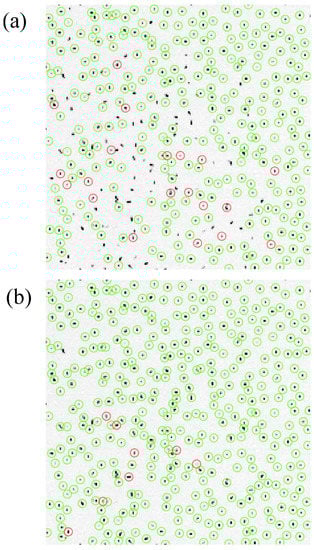 In Figure 4, the results of particle tracking using the quasi-static approximation (Figure 4a) and the position prediction (Figure 4b) at s (after the crystal has melted in its centre) are presented. As can be seen, using the quasi-static approximation resulted in losing many particles. The quasi-static approximation algorithm was not able to link the trajectories for frames for a relatively large number of particles. Moreover, the number of new (rediscovered) particles (circled in red) was quite high, which can have an impact on the accuracy of the computed velocities and kinetic energies. By contrast, when predicting the position for trajectory linking, most of the particles were properly detected and linked.