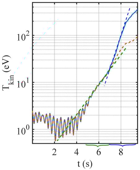 In Figure 5, the evolution of the microparticle kinetic temperature is shown using the two different linking strategies. As can be seen, while the kinetic temperature of the monolayer is not too high ( eV), both strategies give equivalent results. For instance, the exponential growth of the kinetic temperature due to MCI in the crystalline phase (from s to s) could be well identified in both cases. However, when the crystal melted and MCI entered in the fluid phase, the results were quite different: In the case of the quasi-static approximation, the energy growth rate barely increased, and the kinetic temperature saturated at ≳100 eV. This is due to the fact that fast particles moving more than 1.5 pixels per frame (corresponding to a kinetic energy of ∼470 eV) were lost. At s, the energy growth rate decreased due to MCI saturation [,,]. However, the measured kinetic temperature is underestimated because of the lost particle tracks. This is especially true for the quasi-static approximation method. Note that the relatively high kinetic temperature and quite large fluctuations at the beginning of the experiment ( 4 s) were due to small mechanical vibrations of the experimental setup as well as pixel locking and digitisation noise [,].