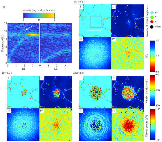 (a) Longitudinal (left) and transverse (right) current fluctuation spectra of the monolayer in the crystalline state for . The arrow shows the traces of mixed polarisation. (b) Monolayer at s. (c) Monolayer at s. (d) Monolayer at s. In (b–d), shows the map of defects. The number of closest neighbours is colour-coded; shows the value of the bond orientational order ; shows the particle number density; shows the particle kinetic energy (global drift is not removed). In (b), the white square shows the area used to compute the current fluctuation spectra shown in (a), and the red square shows the area used for computing the evolution of the kinetic temperature shown in Figure 5.