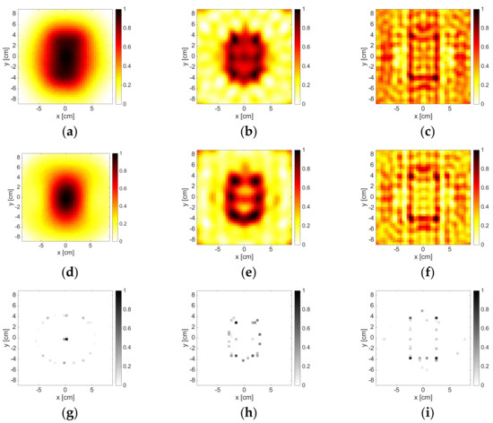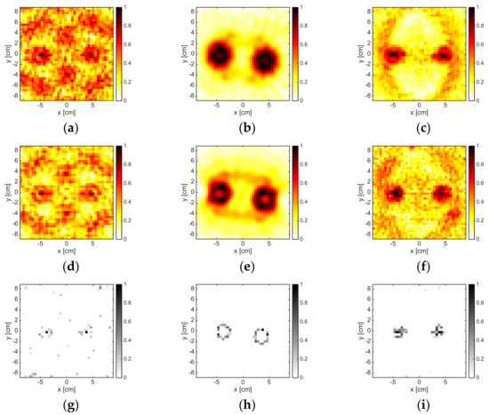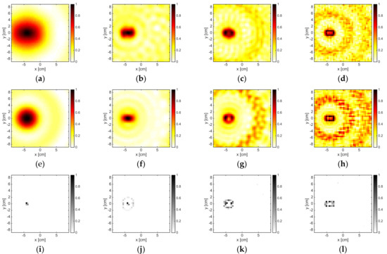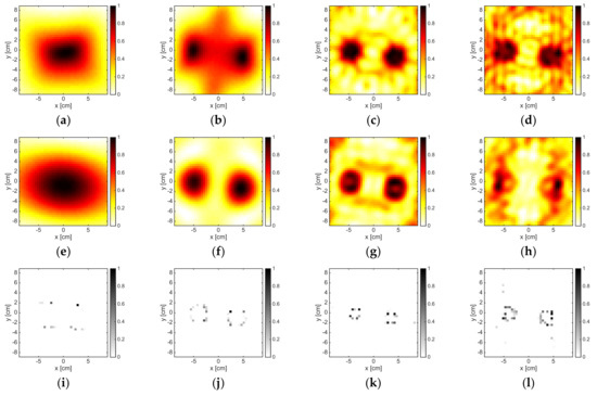 On the contrary, the B-IS method is able to provide quite accurate reconstructions of the support also in the frequency range 6–8 GHz. When the frequency and the size of the overall target’s system were further increased, completely meaningless reconstructions were obtained by LSM and OSM, while B-IS indicator at least localized the two targets (see Figure 9g). In order to improve the reconstruction accuracy of the three methods, it was necessary to process a higher amount of data. This was witnessed by the reconstructions reported in Figure 9 corresponding to M = 36 at both 8 GHz and 16 GHz. However, at 16 GHz, the increase of the number of data was not enough for LSM and OSM to provide indicator maps free of artifacts.