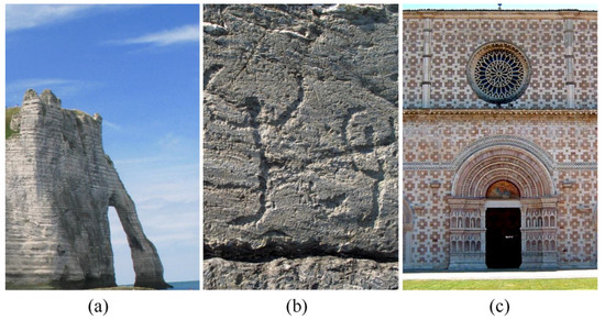 Figure 1. Terminology in stone decay research; (a) rock (chalk cliffs, Étretat, France); (b) cultural rock (Rupe Magna, rock engraving park of Grosio, Italy); (c) building stone (Santa Maria di Collemaggio, XIII century, L’Aquila, Italy). Both (b) and (c) can be referred to as cultural stone.