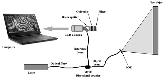 Electronic speckle pattern interferometry (ESPI), also called digital speckle pattern interferometry (DSPI) is an experimental technique like holographic interferometry but designed to overcome its operational difficulties [21,22]. A laser source, a camera with its acquisition card and a computer are needed to manage the system (Figure 2); the use of optical fibers enhances portability, while the filter, centered on the laser wavelength, allows working in ambient light. When performing ESPI, the diffractive optical element (DOE) must be removed.