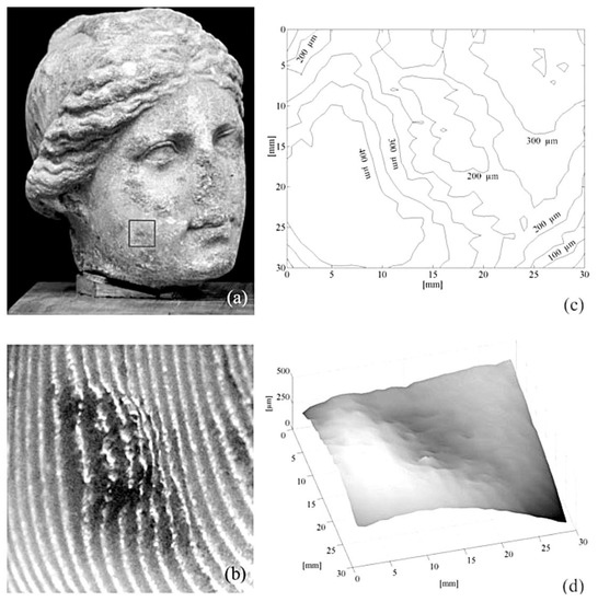 Figure 4. (a) Stone head of Roman age; (b) projected fringe, (c) contour plot, (d) 3D plot of the surface, on the selected area of (a) [30].