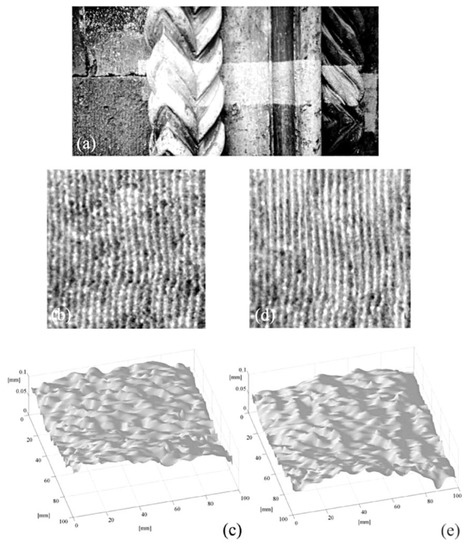 Figure 5 shows an example of measurements performed on the stone portal of the Atri Cathedral (XIII century). A comparison between Figure 5c,e proves that the cleaning action preserves the surface texture (same mean roughness).