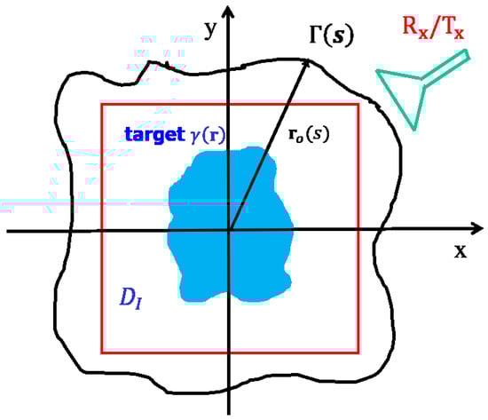 The starting point for problem formulation is the assumption that the target consists of an ensemble of independent and non-directional scattering centers []. Since multiple interactions, creeping waves and shadowing effects are neglected, the target reflectivity and the scattered field are linked by the following linear integral operator