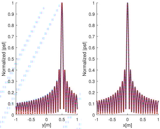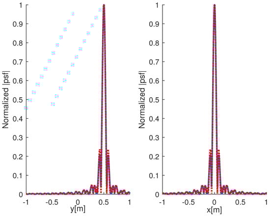 and and being Bessel functions of zero and first order. In Figure 2, the comparison between the actual point-spread function and the one returned by (18) is shown. As can be appreciated, the two curves overlap very well, this means that the leading term approximation exploited to derive (18) works fine.