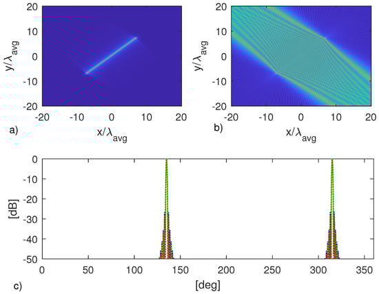 The first object is a bar of length . The corresponding multi-frequency and single-frequency images are reported in the panels (a) and (b) of Figure 6, while the RCS estimations are compared in (c). As can be seen, despite the evident degradation of the reconstructed image, single-frequency configuration allows us to obtain an RCS estimation which is very similar to the multi-frequency one; indeed the three curves overlap very well.