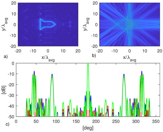 Object in Figure 5a. (a) Multi-frequency image. (b) Single-frequency image. (c) Normalized RCS at GHz. The green line refers to the actual RCS, while the blue and red lines to the ones computed from multi-frequency and single-frequency images, respectively.