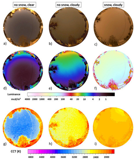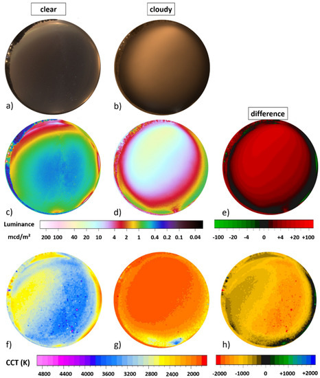 - Jechow, A.; Kolláth, Z.; Ribas, S.J.; Spoelstra, H.; Hölker, F.; Kyba, C.C.M. Imaging and mapping the impact of clouds on skyglow with all-sky photometry. Sci. Rep. 2017, 7, 6741. [Google Scholar] [CrossRef] [PubMed]