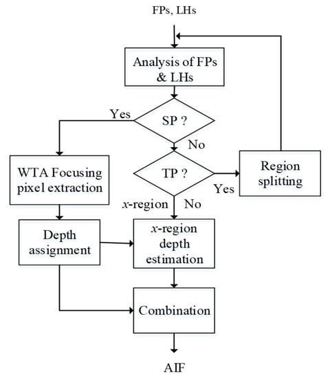 14]. The focal-weighting method computes a weight of 0.1–1.0 for each image in the stack when synthesizing a specific pixel or block of given coordinate along the focal axis, i.e., weights are focal-position-dependent. The weight-optimized algorithms, however, refine the pixel-dependent weights subject to certain smoothness conditions. Though they are capable of getting better AIF and depth estimation, it seems time consuming and unsuitable for real-time applications. On the other hand, WTA seems to be a special case of the focal-weighting strategy that only one focal position in the stack is selected and has a weight of 1.0, while others have zero weights. WTA is simpler and popular in many applications. There are also some modified algorithms to improve the WTA scheme. For example, [
