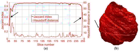 In both cases, the metrics (JI, HD) were calculated on a per-slice basis. JI is a strict measurement as compared with accuracy and other metrics, as it does not include the true negatives. On the other hand, accuracy includes the TN in both numerator and denominator and this, especially in cases where the objects of interest are small and there are large areas of background (e.g., the upper and lower slices of the cell), would render very high accuracy. As JI does not count TN, the values decrease towards the higher and lower slices of the cells, as can be seen in the edges of Figure 4a,c. Accuracy values would increase in these slices.