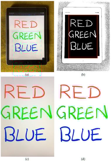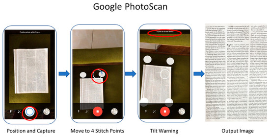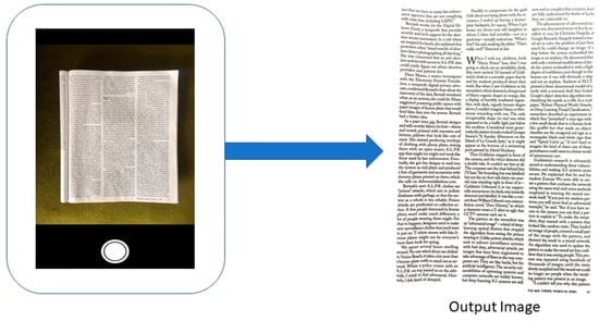 - Chen, F.; Carter, S.; Denoue, L.; Kumar, J. SmartDCap: Semi-automatic capture of higher quality document images from a smartphone. In Proceedings of the 2013 international conference on Intelligent user interfaces, Santa Monica, CA, USA, 19–22 March 2013; pp. 287–296. [Google Scholar]