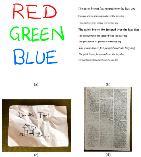 - Burie, J.-C.; Chazalon, J.; Coustaty, M.; Eskenazi, S.; Luqman, M.M.; Mehri, M.; Nayef, N.; Ogier, J.-M.; Prum, S.; Rusiñol, M. ICDAR2015 competition on smartphone document capture and OCR (SmartDoc). In Proceedings of the 2015 13th International Conference on Document Analysis and Recognition (ICDAR), Tunis, Tunisia, 23–26 August 2015; pp. 1161–1165. [Google Scholar]