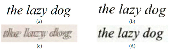 Zoomed results extracted from the smallest line of an image from the synthesized text image dataset, scanned using a smartphone with the image showing on a tablet screen. (a) Original Image; (b) CleanPage; (c) Google PhotoScan; (d) Microsoft Office Lens.