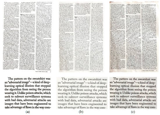 Sample results from a magazine page scan showing a zoomed paragraph. (a) CleanPage; (b) Google PhotoScan; (c) Microsoft Office Lens.