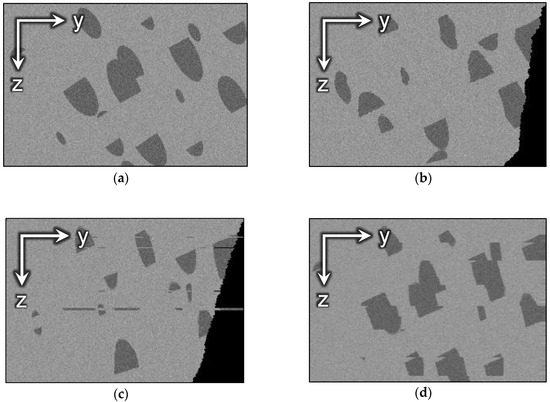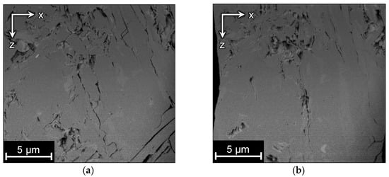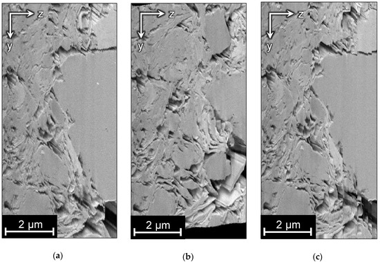 Conventional algorithms used for the alignment of an image series [12,13,14,15] are based on the comparison of two adjacent slices. Due to local anisotropy in the orientation of edges in the XZ and YZ planes, existing alignment approaches make “smooth” distortions of pore space geometry additionally to the correction of ragged edges. The alignment algorithm tries to straighten the structures and make them perpendicular to the cutting plane, leading to unpredictable deformations in both the X and Y-directions along the Z-axis. Figure 2a,b demonstrate side views of a FIB-SEM image of a natural rock before and after alignment and outline the distortions.