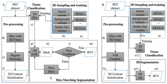 Comparison of the Positron Emission Tomography (PET) system proposed in the previous work (A) [24], and the implementation set out here (B). The proposed implementation substitutes the ‘Slice Marching Segmentation’ block (A) with the fully “3D Segmentation” block (B). Therefore, cross-slice information previously ignored is now being completely exploited. Moreover, the artificial stopping condition (step i) is no longer necessary. Additionally, (steps b, c, f, and g) were modified in order to provide a 3D sampling and training (step b1), a 3D tissue classification (step c1), 3D contour initialization (step f1), and 3D AS (step g1).