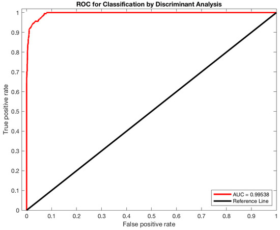 To train and test the classifier, tumor, background and border-line tissues were automatically identified on PET images using the strategy described in Section 2.1.1. Starting from eight patient cases, the sampling process produced 13,762,560 vectors divided into 28,152 lesion vectors, 16,107 border-line vectors, and 13,718,301 background vectors. In total, 80% of the samples were used for training, while the remaining 20% were used for testing. Concerning the K-Fold cross-validation, the optimal k value was determined through the trial-and-error method (k ranged: 5–15, step size of 5), k = 5 corresponded to the highest classification accuracy. The capability of the 3D DA classifier in discerning different tissues achieved excellent result with a sensitivity of 99.09%, a specificity of 90.58%, a precision of 98.53%, and an accuracy of 96.46%. Figure 2 shows the receiver operating characteristic (ROC) analysis performed to assess the efficiency of 3D DA classification after the training phase. The area under the curve (AUC) is 0.99538. The maximum AUC is 1, which corresponds to the perfect classifier. After this training, the classifier is able to label new tissues and is ready to be integrated in the segmentation process (as described in Section 2.1.2).