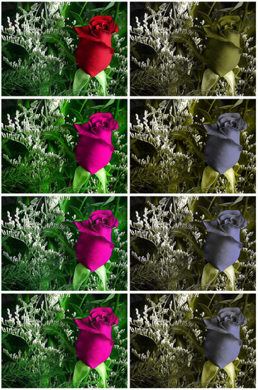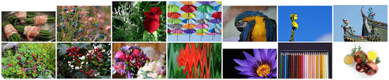 In order to test the proposed algorithm, we gathered a small set of colourful images from the web with dominating red–green and blue–yellow contrasts. All the gathered images are freely available under the CC0 license (https://creativecommons.org/share-your-work/public-domain/cc0/). The images are shown in Figure 1.