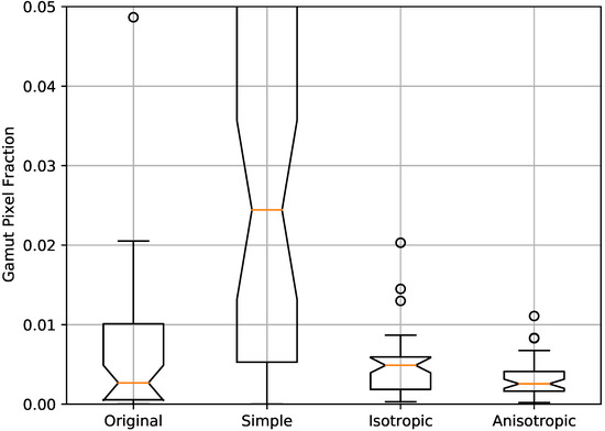 The resulting GPF values for all the images are shown as a box plot in Figure 4. Although the distributions for isotropic and anisotropic daltonisation are overlapping, they are statistically significantly different according to the Wilcoxon signed-rank test with a p-value , and with a median in favour of the anisotropic daltonisation.