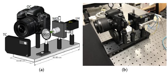 (a) Setup scheme. LH, laser head; MO, microscope objective; GGD, ground glass diffuser; OC, optical camera; TC, thermal camera. Approximate total weight: 3 . The supporting breadboard can be mounted on a stiff photographic tripod. (b) Picture of the device.