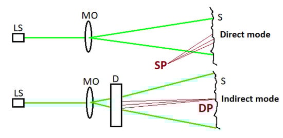 Schematic setup in direct and indirect configuration. LS, laser source; MO, microscopic objective; D, diffuser; S, surface; DP, diffuser speckle pattern; SP, surface speckle pattern.