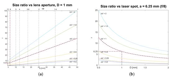 - The ratio of distances can be fixed as required by the out-of-lab condition, e.g., a museum environment, and the indirect to direct speckles’ size ratio r can be controlled through the laser spot D, or through the lens aperture a, following the calibration curves, respectively, in Figure 5a,b.