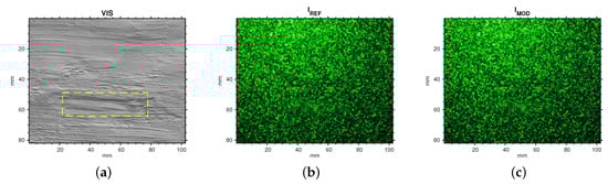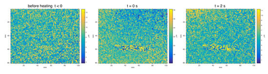 The thermal stimulus was applied to the painting using a single 750 quartz tungsten infrared emitter. As discussed in Section 4.3, the duration of the thermal stress and the “response time” were critical parameters to optimize. Indeed, similar to any other active technique, i.e., based on the response of the system to an external solicitation (for example, infrared thermography), it is not possible to standardize such parameters in case of complex (and unknown) objects such as artworks. However, by quantifying the thermal load in the raise of the surface temperature, measured by the thermal camera, the duration of the stimulus can be set and initially suggested, for example, by previous works [,,,]. Therefore, different experiments were performed varying the duration of the heat stimulus (5 s, 15 s and 30) up to a maximum ∼5 C and acquiring the sequence of speckle patterns during the relaxation phase, after the lamp switch-off. In the case of the painting model, a short-pulse stimulus (5 ) was the most effective. This also satisfied the requirement of noninvasiveness.