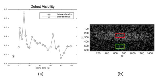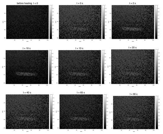 As one can see, a discontinuity in the gray level in the SC algorithm output of the normalized correlation coefficients (Equation (5)) well locates the defective region and its extension, where the painting surface undergoes an anomalous displacement. As expected, correlation computed on a pair of specklegrams of the sample in equilibrium before the thermal pulse does not reveal the defect. The bright decorrelated pixels that also appear in other regions, supposed to be non-defective, may be attributed to proper material inhomogeneities due to the handmade nature of the sample, as well as to external noise. As mentioned above, the effectiveness of speckle photography is based on the fact that the bulk defect, after thermal loading, determines a local irregular deformation of the surface and thus of the laser speckle activity. We see that in the case of pictorial detachments, which are positioned immediately beneath the surface, the defect is early detected at the beginning of the relaxing phase. The maximum visibility is observed at s, persisting across the 100 s sequence with a contrast that varies as the deformation of the defective region behaves different from the entire regular surface. In the correlation map computed by the SC algorithm, this can be quantified in the following visibility parameter